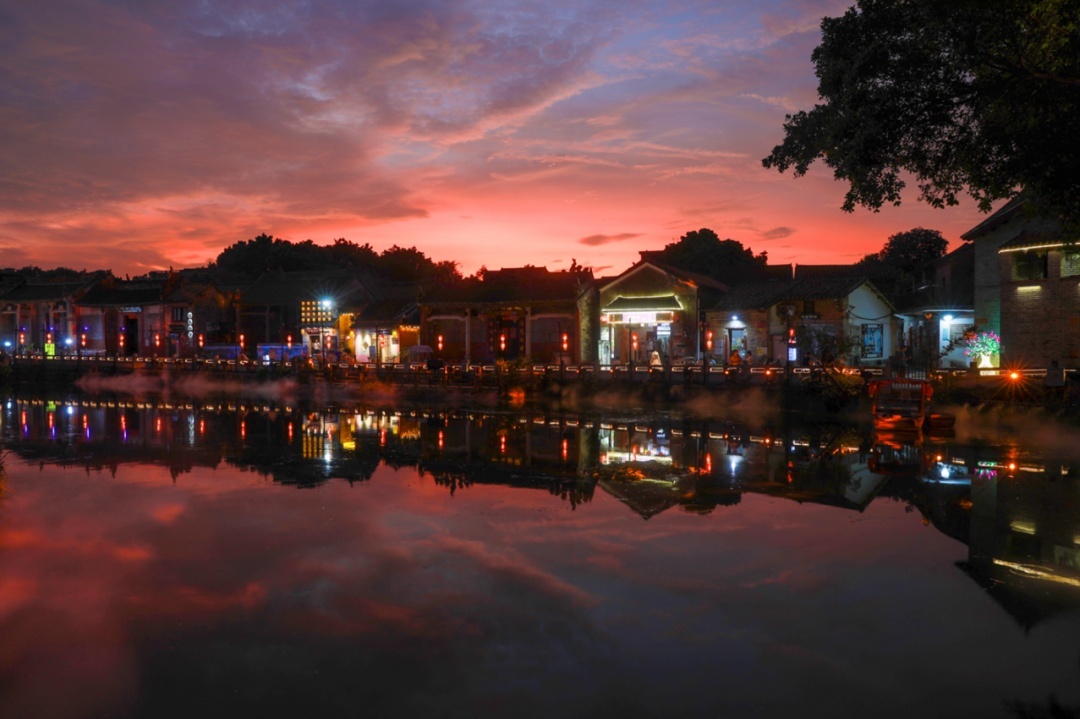 傍晚的南社,是一天中最温柔的时刻。夕阳把祠堂的镬耳山墙染成金黄,倒映在水塘中,波光潋滟如油画。沿着塘边散步,看光影从明到暗,听归鸟声声,心也跟着静了下来。